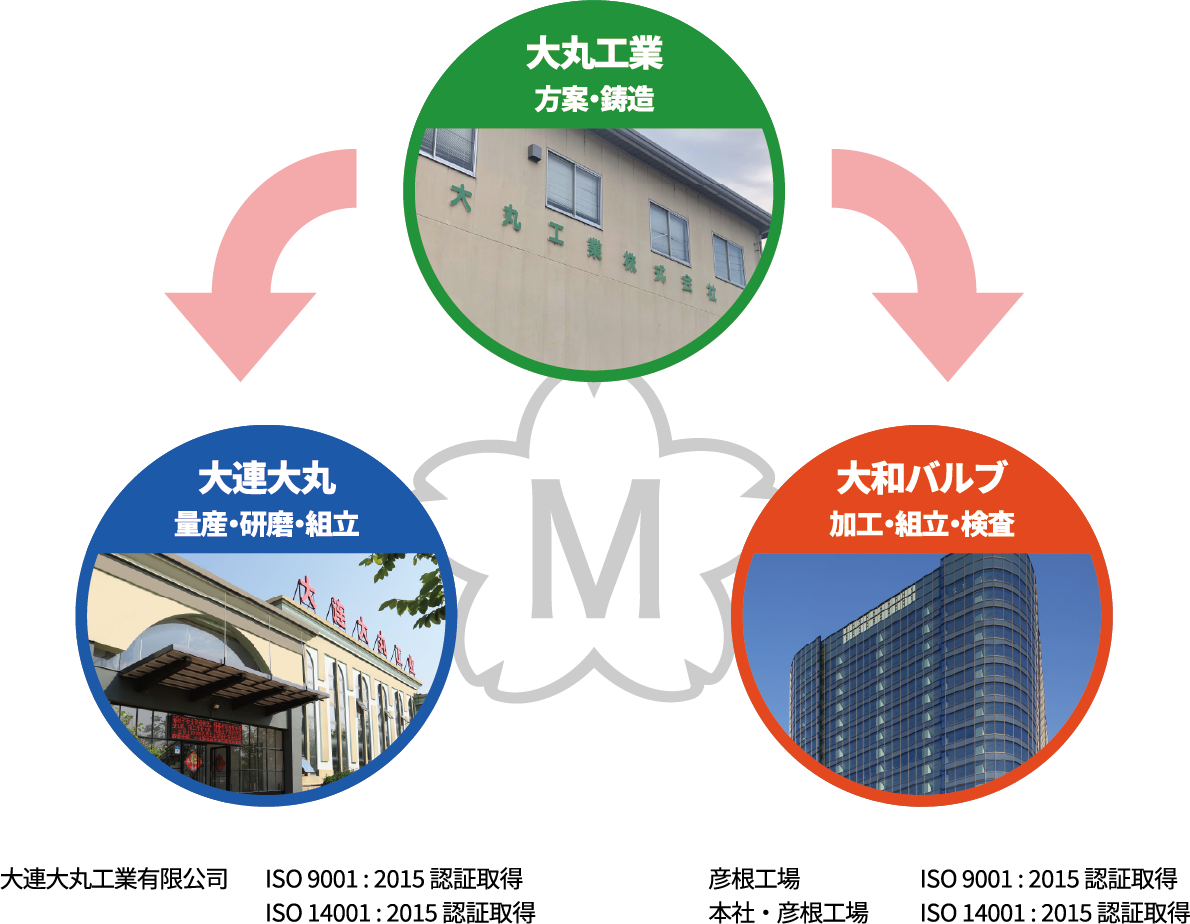 大和バルブ、大丸工業、大連大丸工業の三社間での連携を強固にし、グループの総合力でトータルサポートいたします。